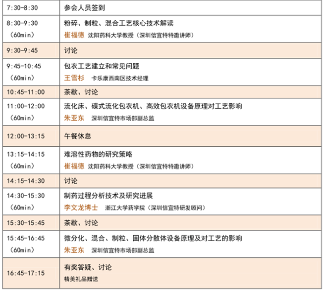 為加強(qiáng)制劑人員對固體制劑工藝及設(shè)備原理的理解,特邀請崔福德教授做專場講座,主要介紹固體制劑的制備工藝原理以及難溶性藥物的研究策略,信宜特研發(fā)顧問浙大藥學(xué)院李文龍博士,將結(jié)合信宜特正在開發(fā)的光譜成像技術(shù)對連續(xù)化生產(chǎn)的意義及制藥過程分析技術(shù)做深入解讀,同時(shí)我們還邀請了卡樂康區(qū)域技術(shù)服務(wù)經(jīng)理王雪杉,卡樂康作為包衣輔料及技術(shù)服務(wù)的典范,將著重介紹包衣工藝建立和常見問題分析,信宜特技術(shù)人員將著重介紹制劑設(shè)備原理對工藝的影響,歡迎制劑相關(guān)人員踴躍報(bào)名。